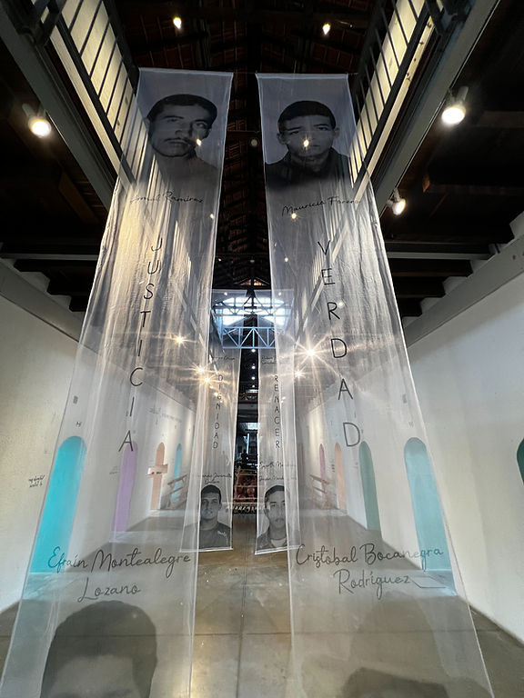 ​Del lado derecho el núcleo, eje simbólico y emocional de la exposición. Esta ala está dedicada a la dignificación de las víctimas. Durante las entrevistas con las familias de las víctimas directas, hubo un elemento que surgió con mucha fuerza, la perseverancia durante todos estos años para que se supiera la verdad. Este video honra la lucha incansable de las familias que, durante más de 20 años, han buscado justicia para sus seres amados. ​